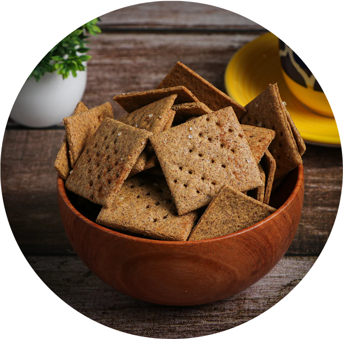 Mix ragi flour, wheat flour, seeds, and salt. Add oil/ghee and water to form dough. Roll, cut into crackers, and bake at 180°C for 15-20 mins until golden. Cool before serving