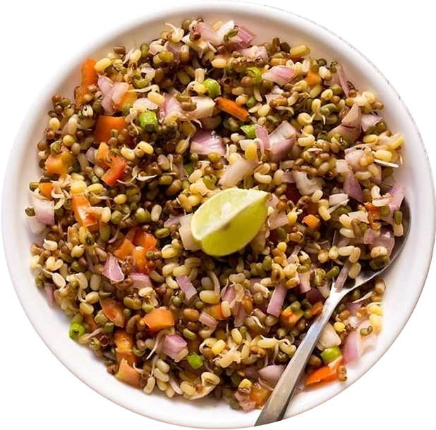 Soak sprouts overnight, steam lightly, then mix with veggies, coriander, lemon juice, and spices. Serve fresh.